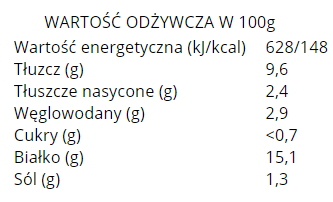 SKŁADNIKI: mięso drobiowe 83%, woda, przyprawy (SOJA, stabilizatory E450, E451, E331, skrobia modyfikowana, substancja zagęszczająca E407A, regulator kwasowości E262, sól, przyprawa zawierająca GORCZYCĘ i SELER, wzmacniacz smaku E621, SERWATKA w proszku (z MLEKA), maltodekstryna, dekstroza, hydrolizowane białko roślinne (z kukurydzy), cukier, mąka grochowa, aromat, ekstrakt przypraw, olej słonecznikowy, aromat dymu wędzarniczego, ocet